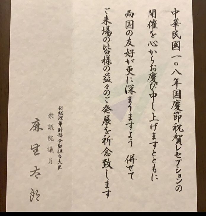 麻生太郎賀電內容:「由衷慶祝中華民國108年國慶酒會的舉辦,祈祝兩國友好更深化,與會來賓日益發展。」