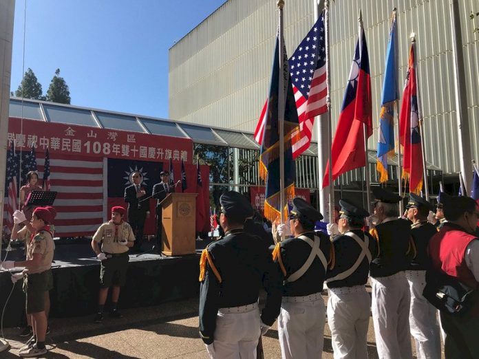 美國舊金山僑胞慶祝中華民國108年國慶,升旗典禮上由陸軍官校旅美同學會旗隊、FASCA海外青年文化志工、男童軍468團儀隊、北一女校友會護送國旗進場。(舊金山經文處提供)