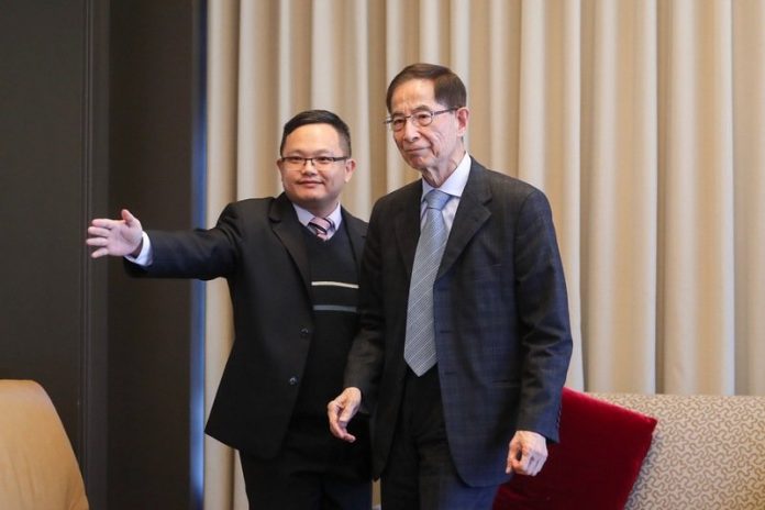 香港各界慶祝雙十節暨辛亥革命108週年酒會10日晚舉行,約有500名嘉賓出席,包括民主黨創黨主席李柱銘(右)。(資料照 / 中央社)