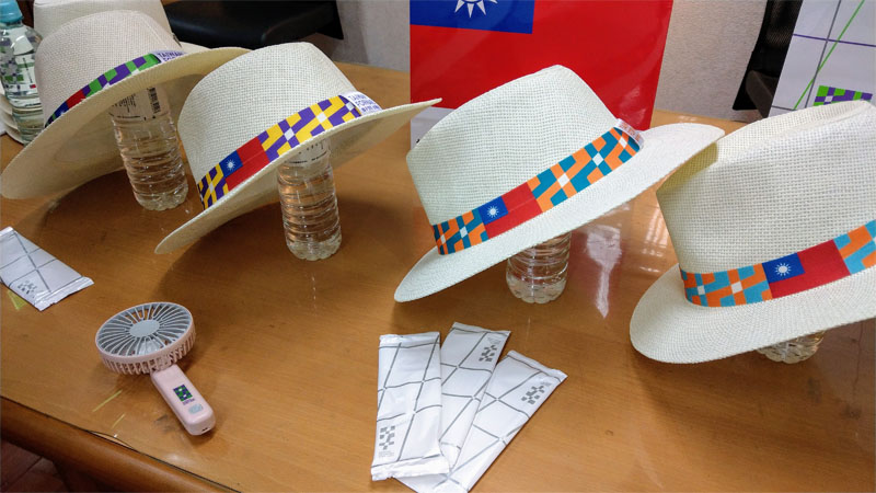 陳宗彥表示,禮賓紙袋一面印著國慶主視覺logo,另一面則是一整幅國旗圖案,希望營造現場來賓手持小國旗的感覺。提袋裡除了大會手冊外,還有徽章、紳士帽、小電扇、濕紙巾、瓶裝水。紳士帽是採用環保可分解的紙纖維製作,帽子邊帶共有4款配色,隨機贈送;瓶裝水是市價高達新台幣80元的海洋深層水,喝起來有椰子水的味道,一整袋國慶小物市價超過500元,預計發送1萬份。他說:『(原音)除了袋子以外,其實今年幫大家很細心準備的是這頂紳士帽,這個帽子在今年我們特別不一樣是採用除了主視覺兩個主色以外,還有搭配4個副色,這4個副色我們一併都設計在帽的邊帶裡面去,那包括還有會拿到濕紙巾和電風扇,還有一瓶在市價上高達80塊的海洋深層水,今年主視覺徽章都會在這個袋子裡面去送給來賓。』