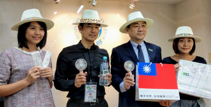 國慶小物24日曝光,陳宗彥(右2)與工作人員展示紳士帽、徽章、紙袋等禮品。(劉品希 攝)