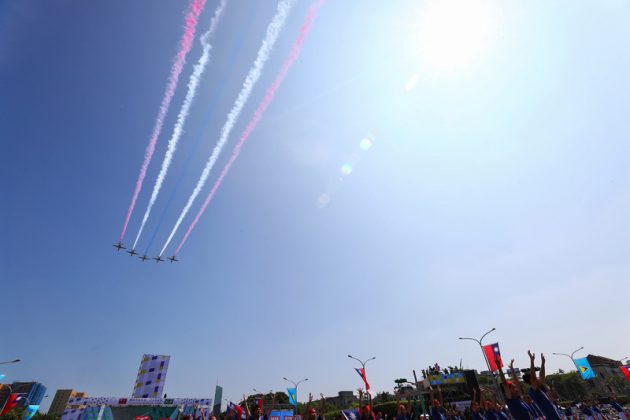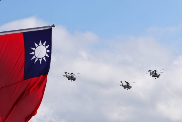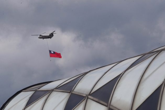 Ein CH-47 Militärhubschrauber mit der Nationalflagge bei der Probe zu den Feierlichkeiten des Nationalfeiertags. 慶預演