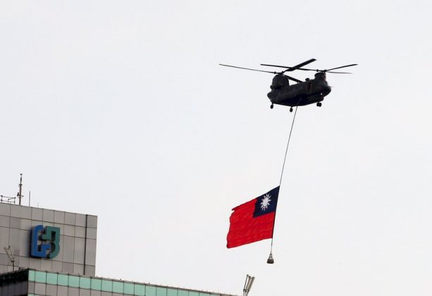 A CH-47 transport helicopter flies above the Presidential Office Building towing a national flag beneath in the run-up to this year's National Day celebrations.