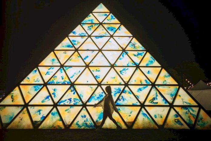 屏東県で開催されている台湾デザイン展が高い人気を博している。9日時点では参観者数がすでに延べ100万人を突破している。写真はメイン展示エリアにあるインスタレーション。ハイテクを駆使して音声と光で夜空を彩り、大勢の参観者を引きつけている。(写真:屏東県提供、CNA)