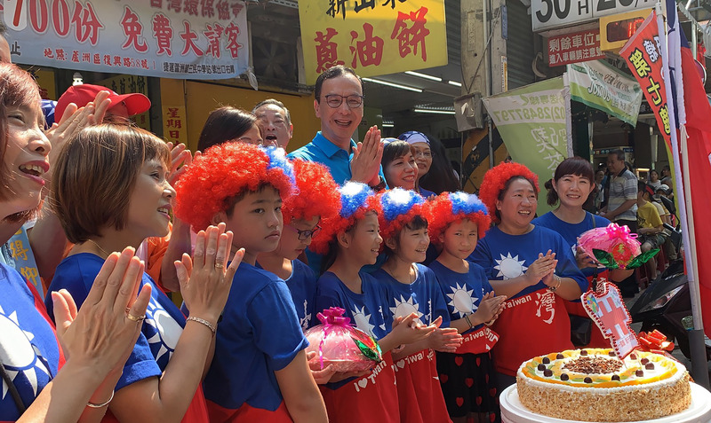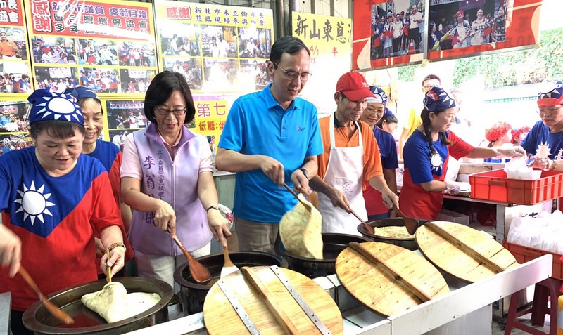 双十国慶節を迎え、朱立倫・前新北市長がお祝いとして台湾のB級グルメ「葱油餅」700個の無料配布を行った。また、国慶節に生まれた子どもたちとともに、誕生日を祝っていた。(写真:CNA)