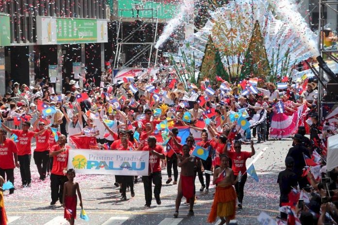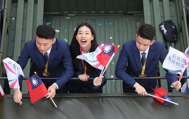 ユニバーシアードや技能オリンピックに参加した選手たちによる「2019ヒーローパレード」。海外からのチームもパレードを楽しんでいる。(写真:CNA)