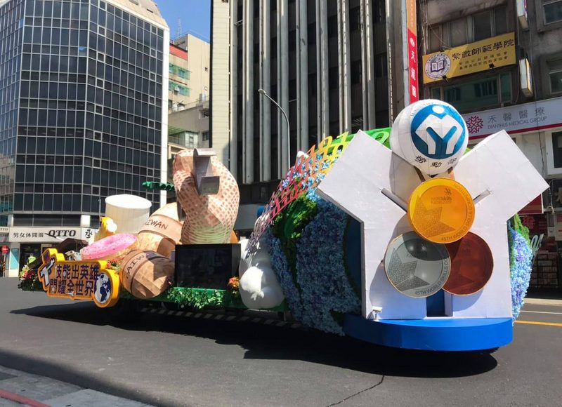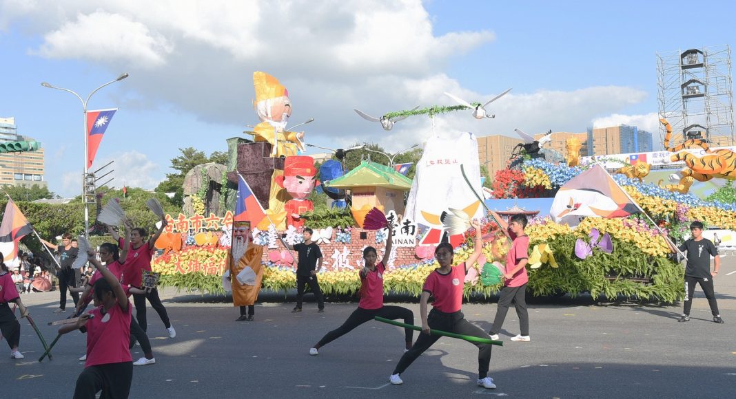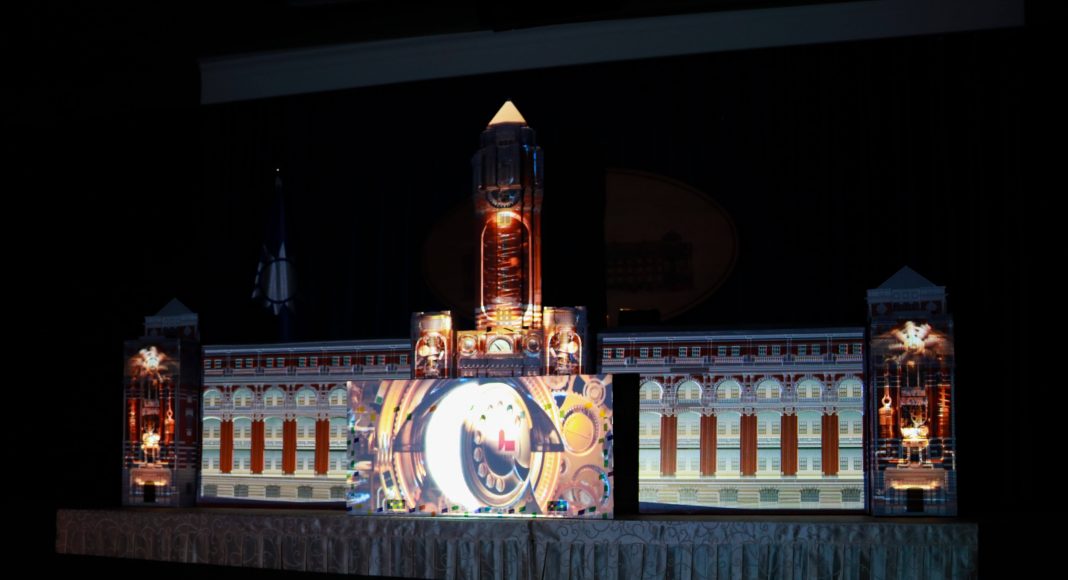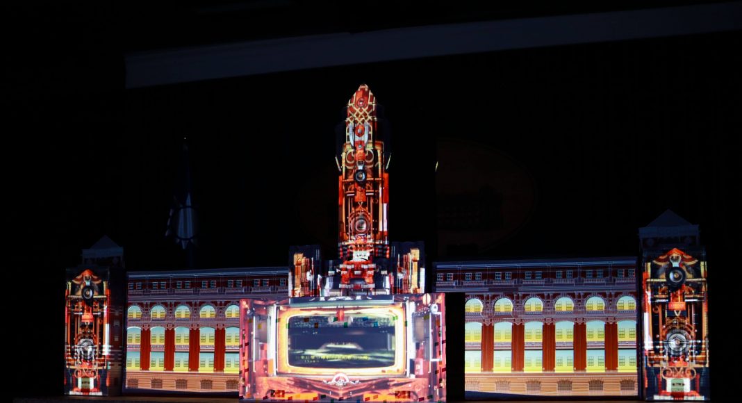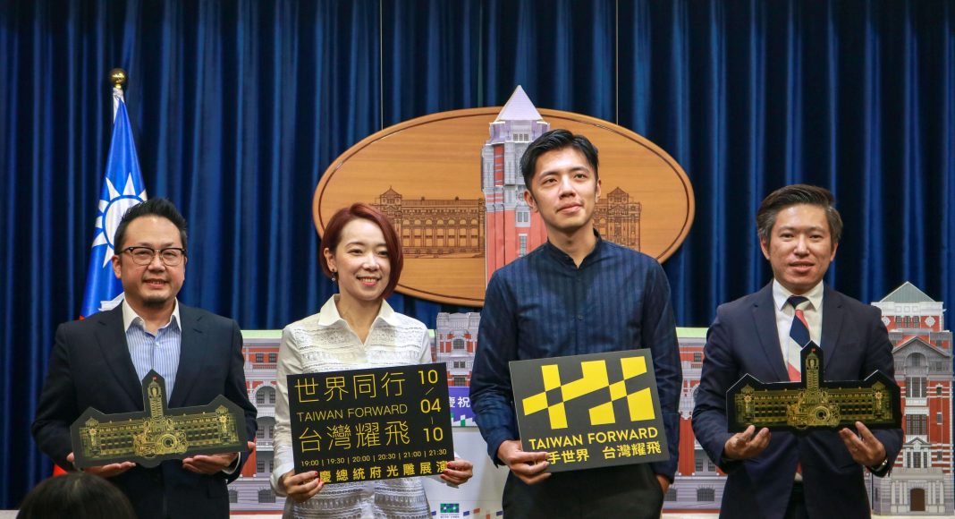 「世界同行 台灣耀飛–2019國慶總統府建築光雕展演」4日晚間正式登場,光雕表現主軸分為序、熱情、勇氣、自信、團結,讓整座總統府化身為百年時光機,以齒輪及各種交通建設作為時光機內零件,表現出總統府百年運轉著國家不斷前行的動力。
