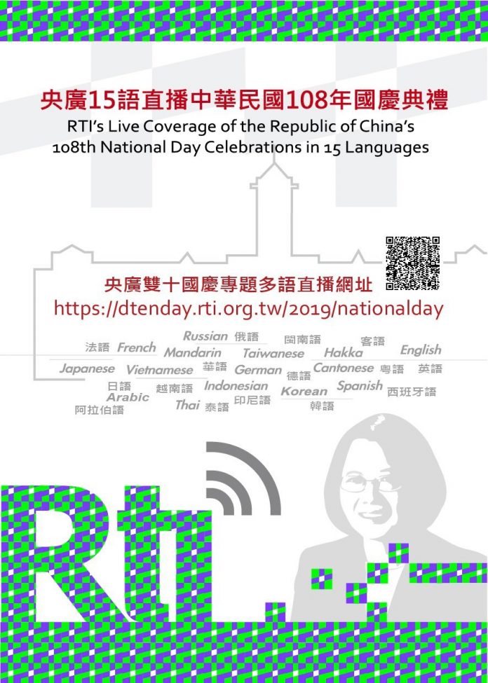 Phát thanh viên của 14 ban ngoại ngữ đài RTI sẽ tiến hành phiên dịch song song (phiên dịch cabin) bài diễn văn của tổng thống trong Lễ Quốc Khánh năm nay, bao gồm 4 loại ngôn ngữ tiếng Hoa là tiếng Đài, tiếng Khách Gia, tiếng Quảng Đông, còn 10 ngoại ngữ bao gồm tiếng Anh, tiếng Nhật, tiếng Pháp, tiếng Tây Ban Nha, tiếng Đức, tiếng Nga, tiếng Indonesia, tiếng Thái Lan, tiếng Việt và tiếng Hàn Quốc. Và để cho bạn bè ở khu vực Trung Đông cũng có thể hiểu được nội dung bài diễn văn trong cùng một thời điểm, đài RTI đặc biệt tăng thêm tiếng Ả Rập, trở thành ngoại ngữ thứ 15 tường thuật bài diễn văn Quốc Khánh, để cho toàn thế giới không có biên giới quốc gia, cùng chung tham dự Quốc Khánh Trung Hoa Dân Quốc.
